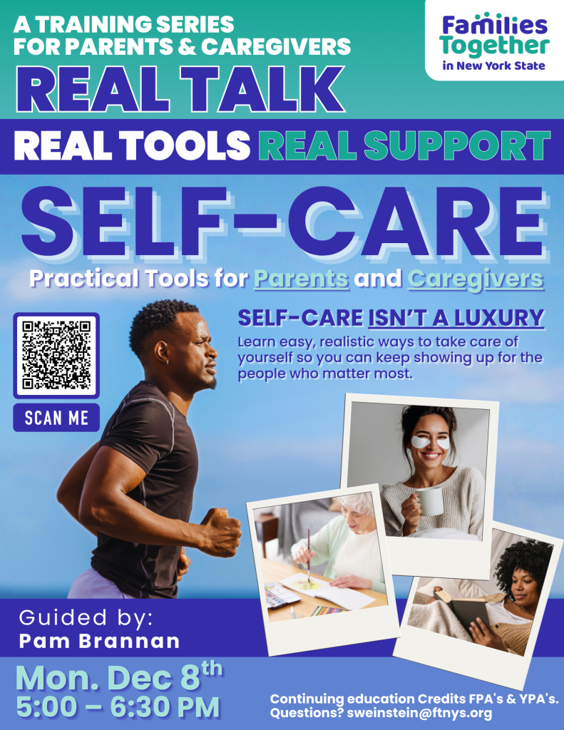 Join Us For Real Talk, Real Tools, Real Support: Self-Care Practical Tools for Parents and Caregivers on Monday, December 8th from 5:00–6:30 PM. Self-care isn’t a luxury, it’s essential. Learn simple, realistic ways to take care of yourself so you can continue showing up for the people who matter most. This session will be guided by Pam Brannan.