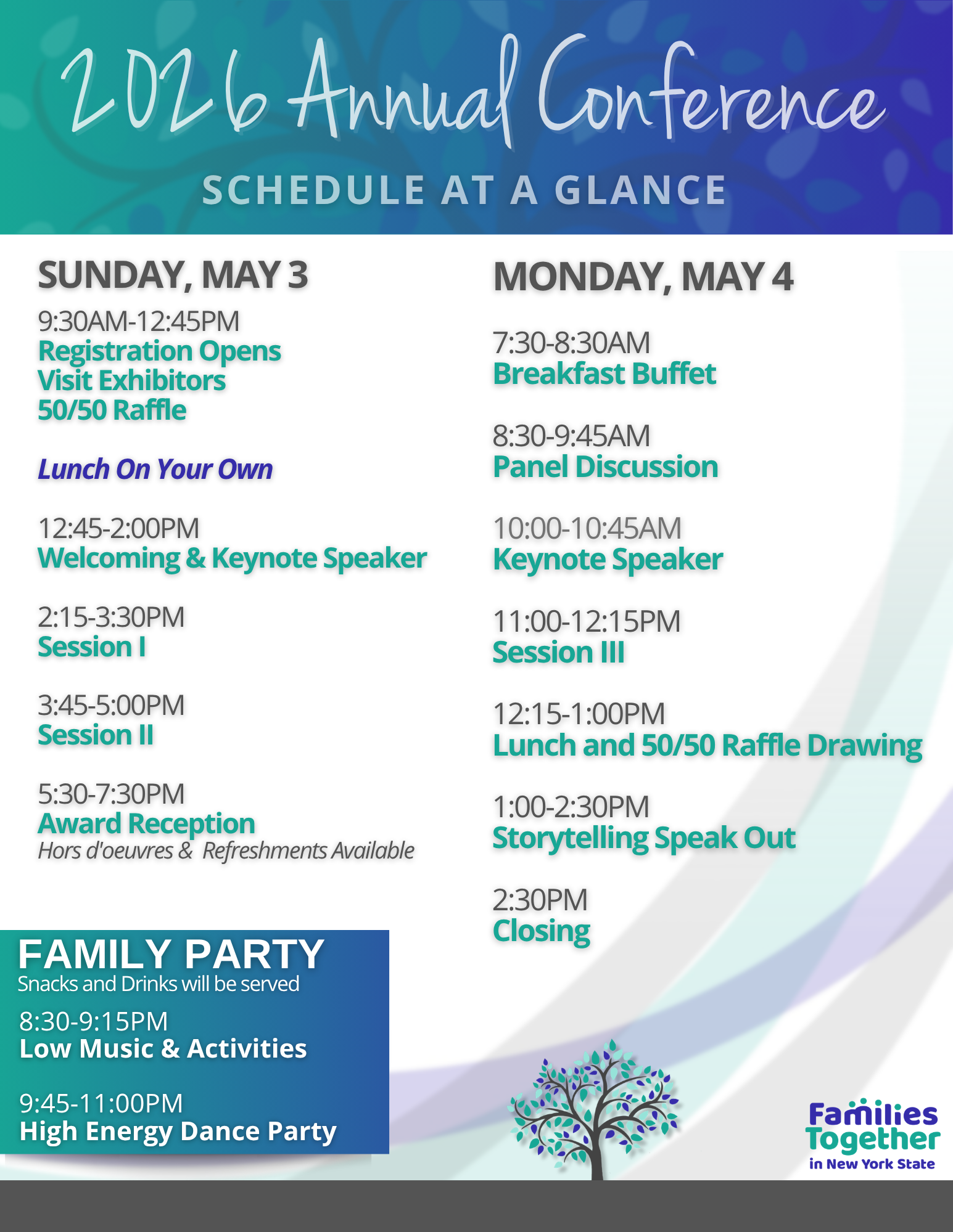 Families Together is seeking sponsors for the 2026 Annual Conference. Sponsoring offers a chance to make a lasting impact on families and youth statewide by ensuring vital resources reach those who need them most. Join us in strengthening partnerships, building healthier communities, and supporting a connected network of care for New York’s families.